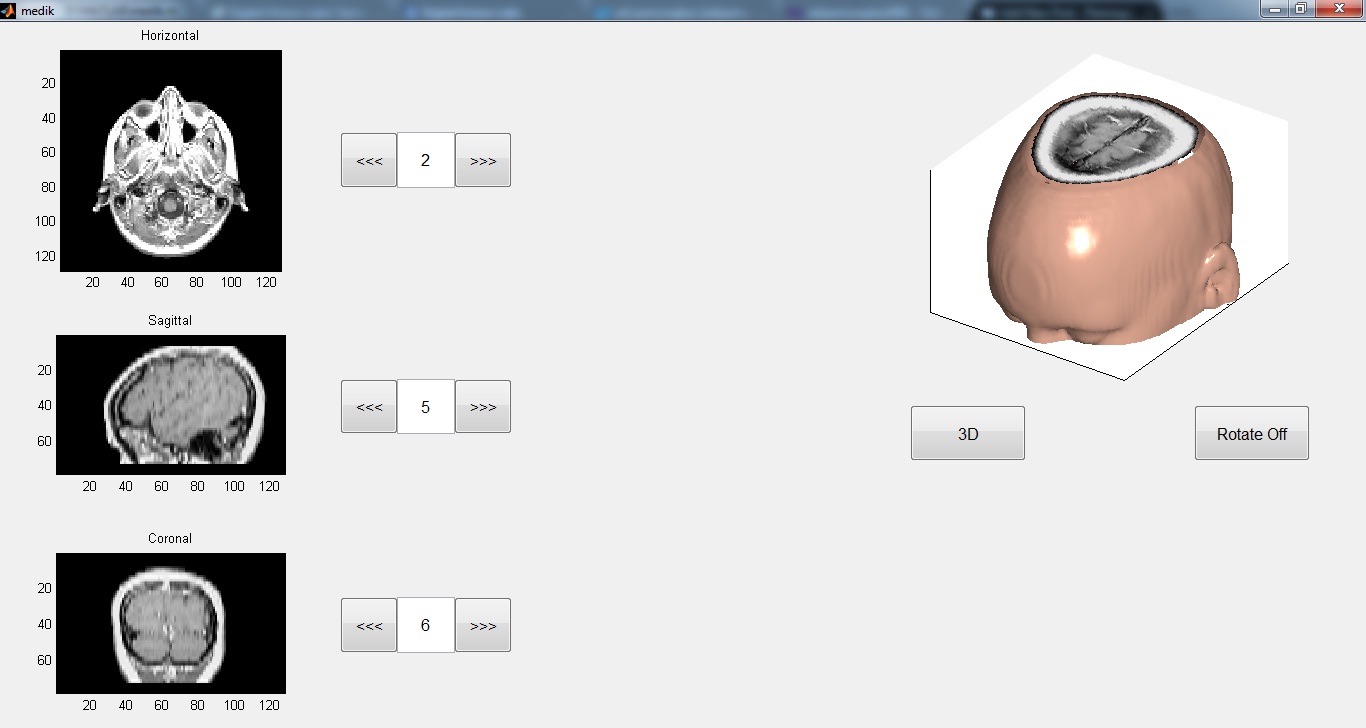 Citra kepala hasil pemindaian Magnetic Resonance Imaging (MRI) yang terdapat pada Matlab terdiri dari 27 slice axial. Berikut ini merupakan contoh aplikasi pemrograman GUI Matlab untuk menampilkan citra kepala tersebut dalam bentuk 3 dimensi pada tampang aksial, sagittal, dan coronal. Proses ini diawali dengan mentransformasi potongan slice citra tampang aksial menjadi 35 slice sagittal dan 45 slice coronal menggunakan transformasi radon. Setelah itu dilakukan rekonstruksi citra sehingga dapat divisualisasikan dalam bentuk tiga dimensi.