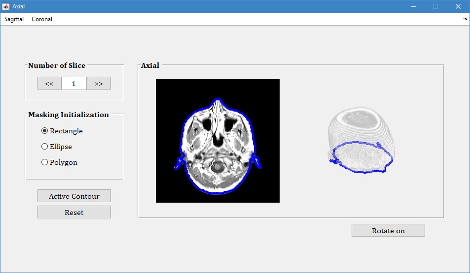 Berikut ini merupakan contoh aplikasi pemrograman GUI Matlab untuk mensegmentasi citra kepala hasil pemindaian Magnetic Resonance Imaging (MRI). Metode segmentasi citra yang digunakan adalah active contour. Pada contoh ini digunakan citra kepala MRI yang ada pada Matlab yang terdiri dari 27 slice tampang axial. Slice citra tersebut kemudian ditransformasi menjadi tampang sagittal dan coronal menggunakan transformasi Radon sehingga diperoleh 35 slice tampang sagittal, dan 45 slice tampang coronal. Hasil konturing dengan metode active contour kemudian direkonstruksi bersama slice citra pada masing-masing tampang dan divisualisasikan secara 3 dimensi.
