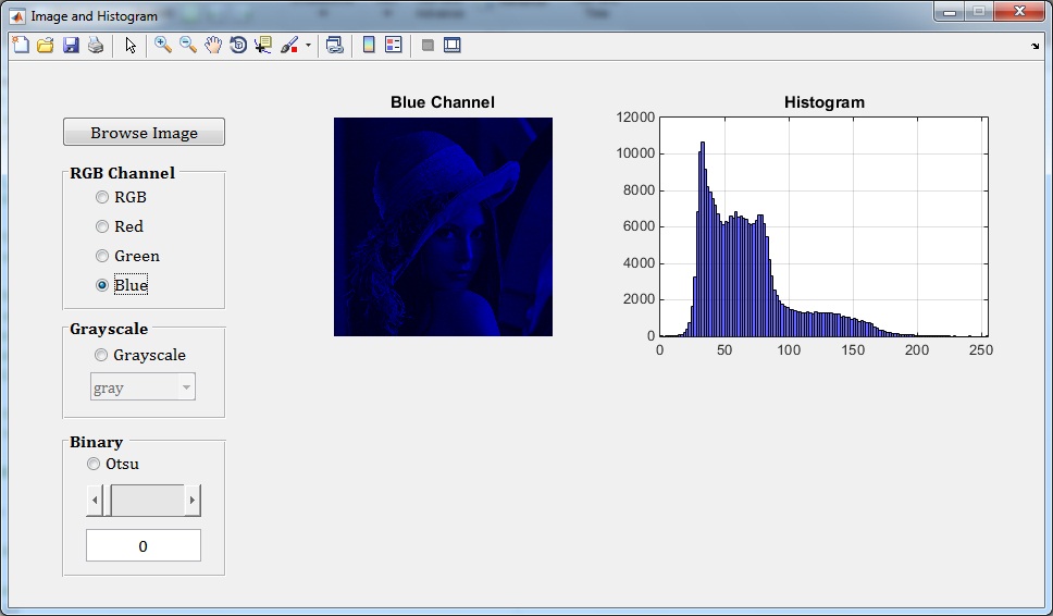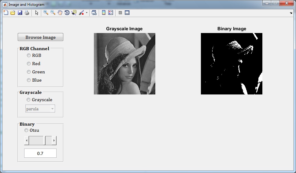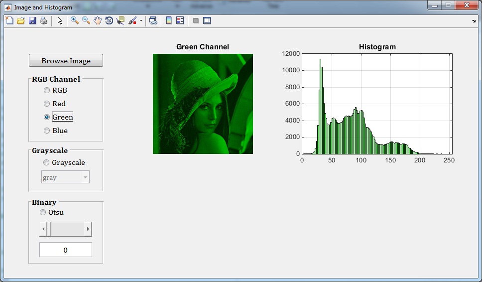 Berikut ini merupakan contoh GUI Matlab representasi histogram pada berbagai jenis citra digital. Pada jenis citra RGB, histogram ditampilkan pada masing-masing kanal warna yaitu kanal merah, kanal hiaju, dan kanal biru. Pada jenis citra grayscale, histogram ditampilkan hanya pada satu kanal warna berderajat keabuan. Sedangkan pada citra biner, histogram ditampilkan hanya pada satu kanal warna hitam dan putih.
