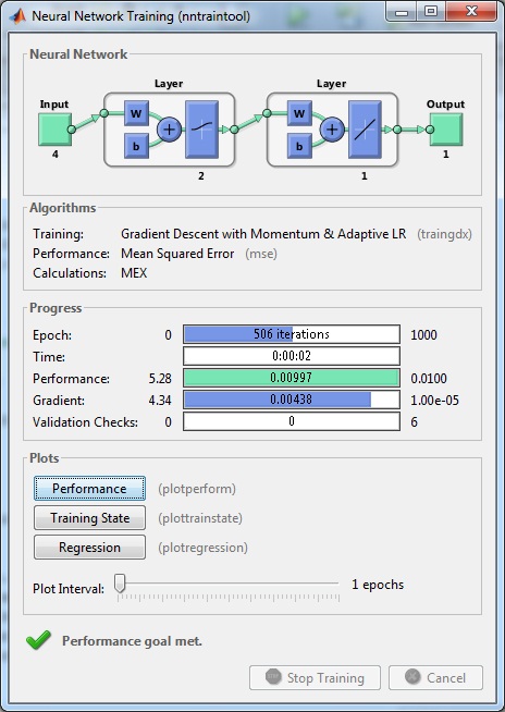 % Memberikan nilai untuk mempengaruhi proses pelatihan net.performFcn = 'mse'; net.trainParam.goal = 0.01; net.trainParam.show = 20; net.trainParam.epochs = 1000; net.trainParam.mc = 0.95; net.trainParam.lr = 0.1;