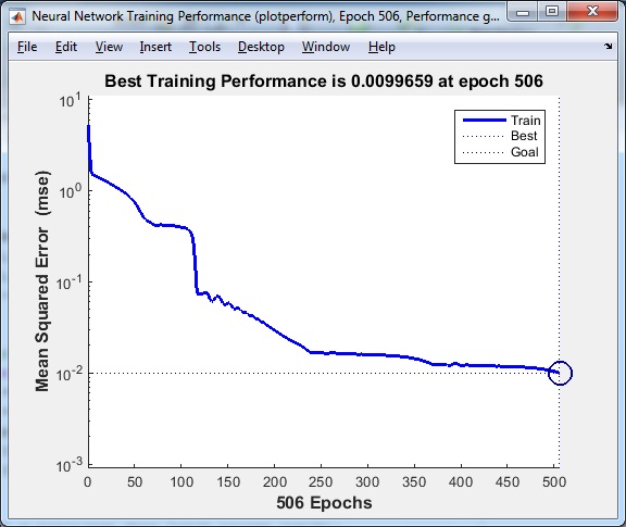 Pada tampilan tersebut ditunjukkan bahwa target error (mse) tercapai pada epoch ke 506. Kita bisa melihat error (mse) yang dihasilkan pada setiap epoch dengan meng-klik tombol ‘performance’ sehingga muncul tampilan seperti berikut: