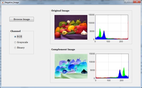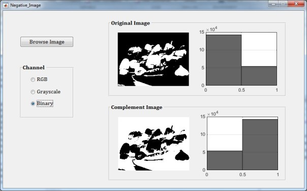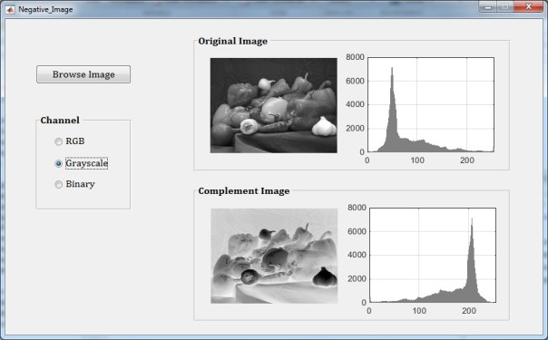 Berikut ini merupakan contoh aplikasi pemrograman GUI Matlab mengenai citra komplemen/ citra negatif