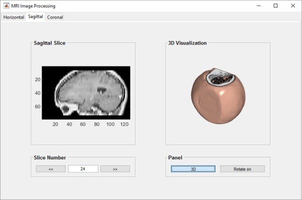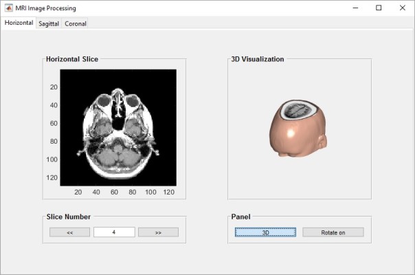 Berikut ini merupakan contoh aplikasi programmatic GUI Matlab untuk pengolahan citra MRI dan visualisasi citra secara tiga dimensi. Koding dapat dijalankan minimal menggunakan matlab r2014b (karena menggunakan komponen baru yaitu uitab).