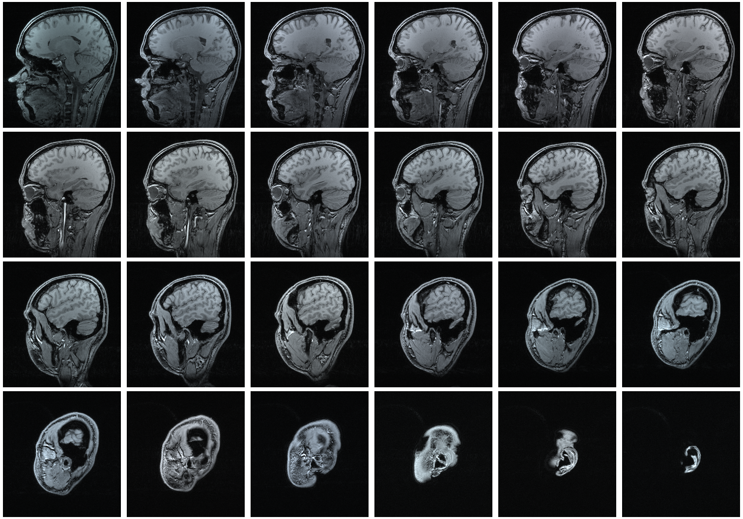 Citra MRI dalam matlab terdiri dari 27 slice tampang horizontal (axial). Tampang horizontal tersebut kemudian ditransformasi menjadi tampang sagittal (35 slice) dan tampang coronal (45 slice) menggunakan transformasi radon. Selanjutnya masing-masing tampang divisualisasikan secara tiga dimensi.