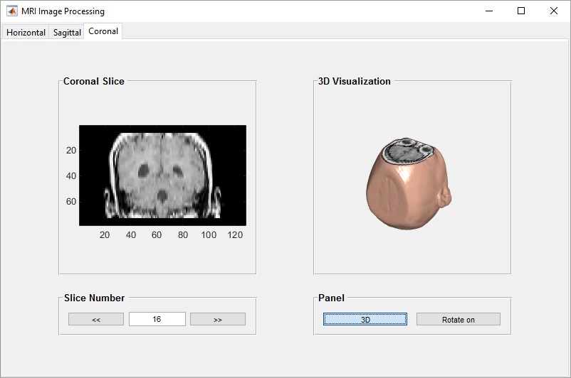 Berikut ini merupakan contoh aplikasi programmatic GUI Matlab untuk pengolahan citra MRI dan visualisasi citra secara tiga dimensi. Koding dapat dijalankan minimal menggunakan matlab r2014b (karena menggunakan komponen baru yaitu uitab).