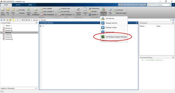 Dalam software Matlab, proses akuisisi citra digital menggunakan webcam dapat dilakukan dengan terlebih dahulu menginstal driver Image Acquisition Support Packages for Hardware Adaptors.