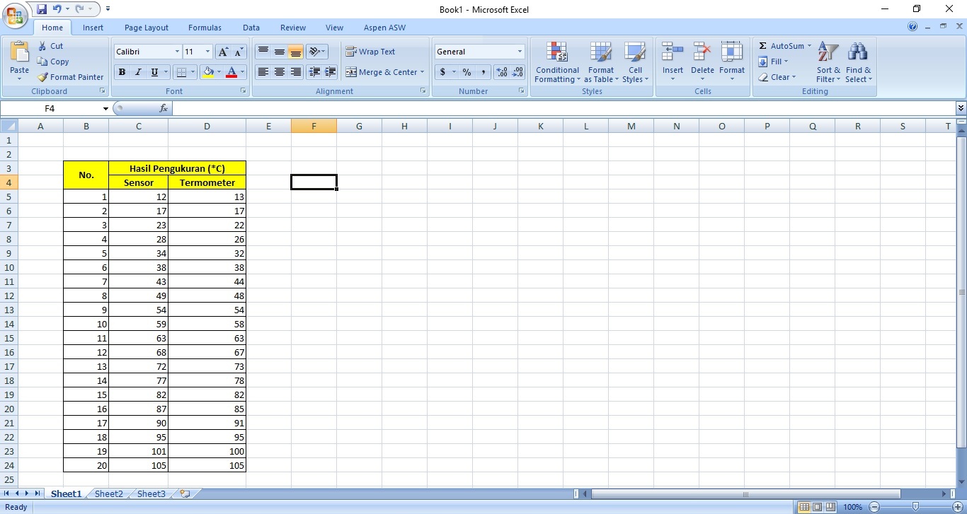 1. Mempersiapkan data, pada contoh ini data terdiri dari hasil pengukuran suhu menggunakan alat dan hasil pengukuran suhu menggunakan termometer digital. Data disajikan dalam format .xlsx (excel)