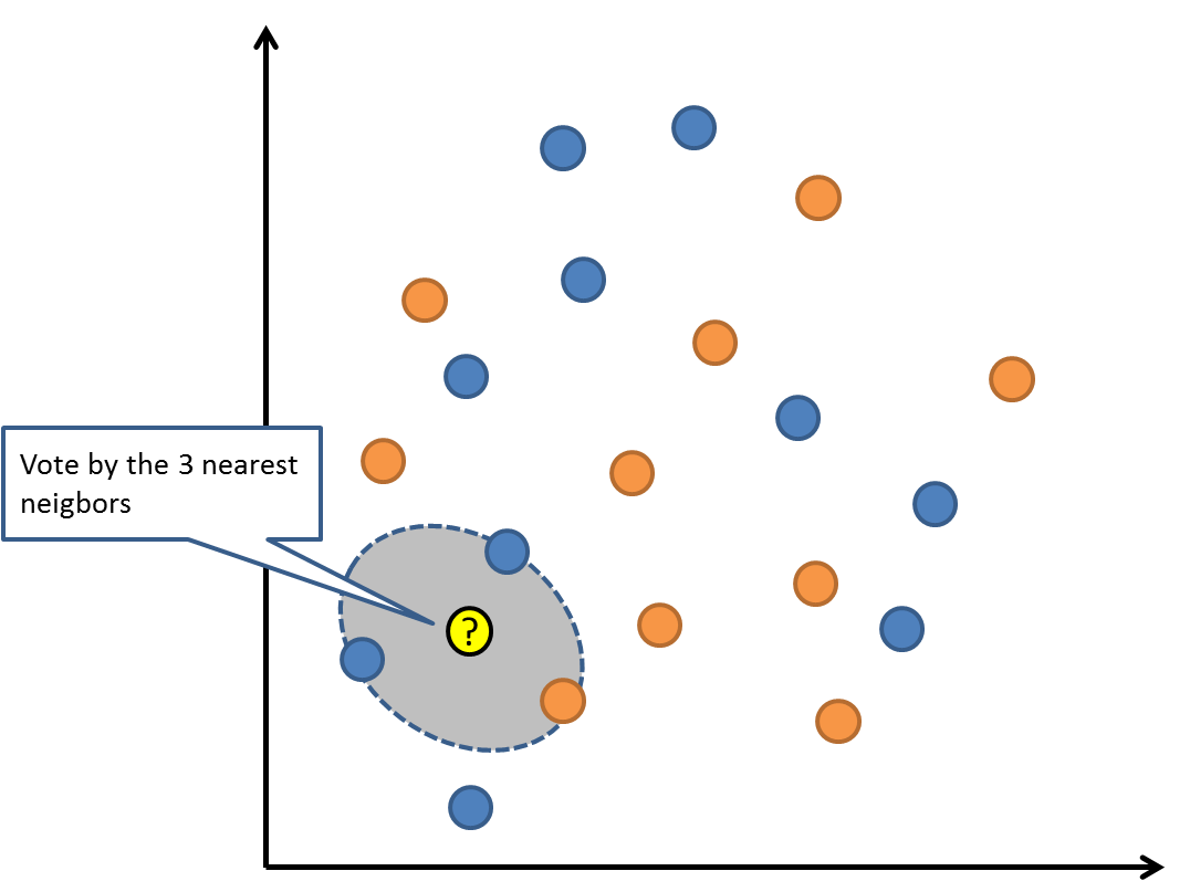 Ilustrasi dari metode yang digunakan oleh algoritma k-nn ditunjukkan pada gambar di bawah ini: