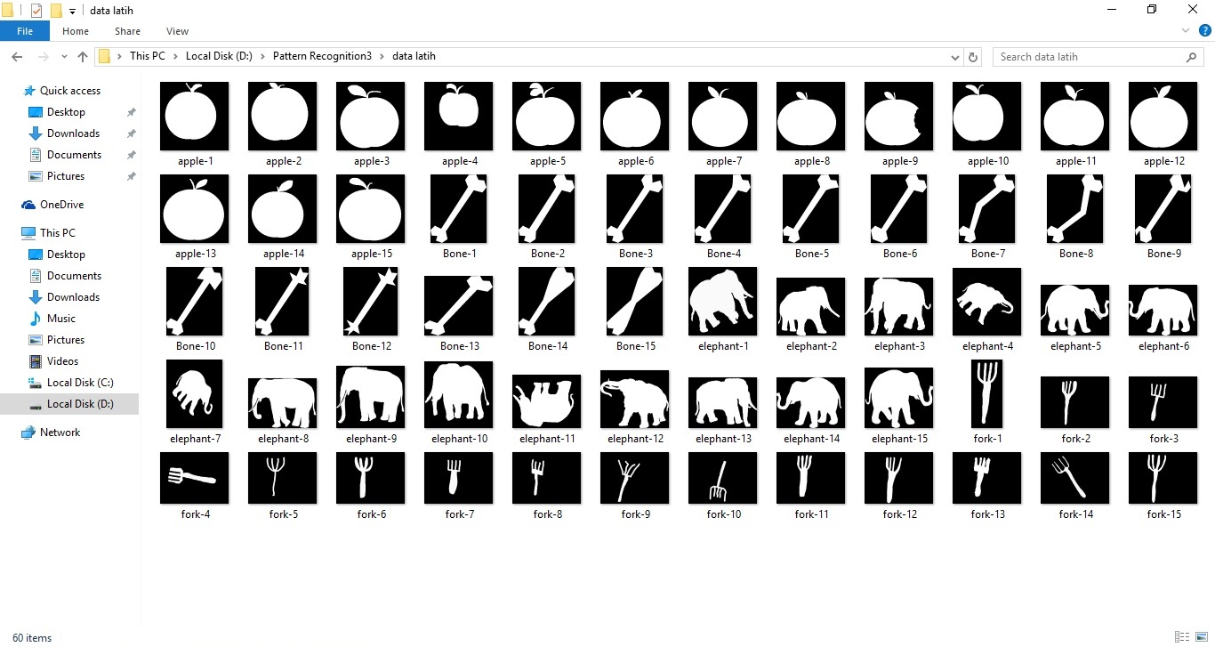 1. Mempersiapkan citra untuk proses pelatihan. Pada proses tersebut digunakan 60 citra yang terdiri dari 15 citra apel, 15 citra tulang, 15 citra gajah, dan 15 citra garpu