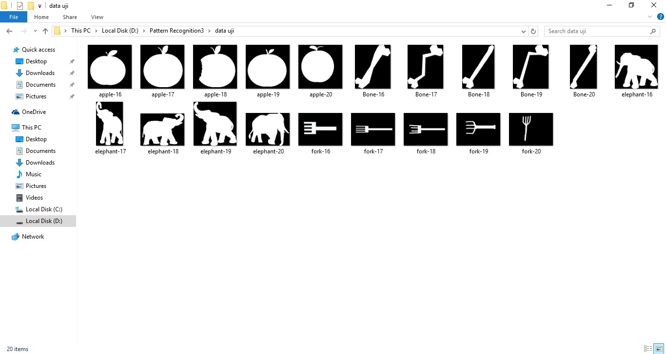 Pada contoh ini k-nn digunakan untuk mengklasifikasi bentuk dari citra apel, tulang, gajah, dan garpu.