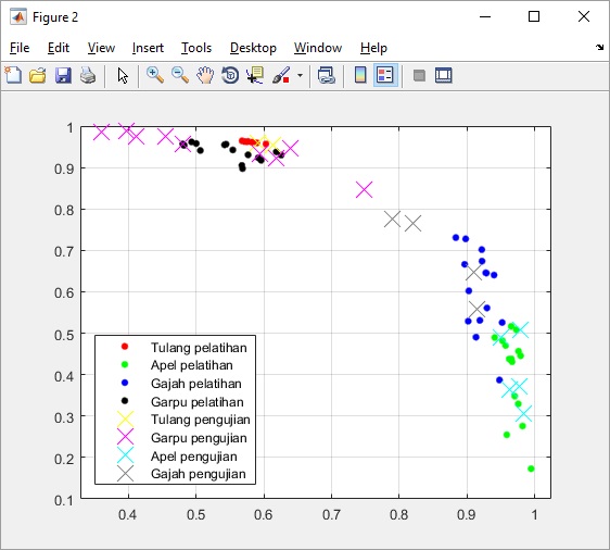 Pada grafik tersebut terlihat distribusi data (nilai metric dan ecentricity) pada masing-masing kelas grup (apel, tulang, gajah, garpu). Pada proses pengujian, suatu data uji dikatakan masuk ke dalam kelas grup apel apabila tetangga terdekat dari data uji tersebut dominan dengan kelas grup A