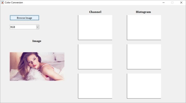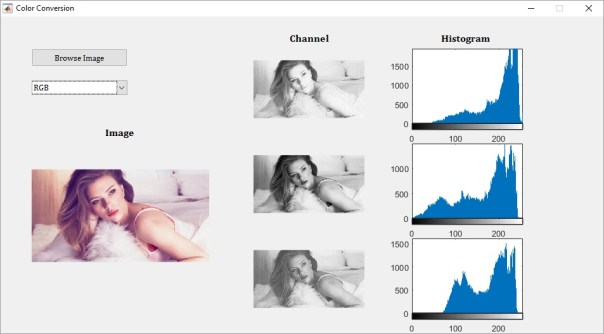 Berikut ini merupakan contoh aplikasi pemrograman GUI Matlab untuk mengkonversi ruang warna citra RGB menjadi ruang warna yang lain.