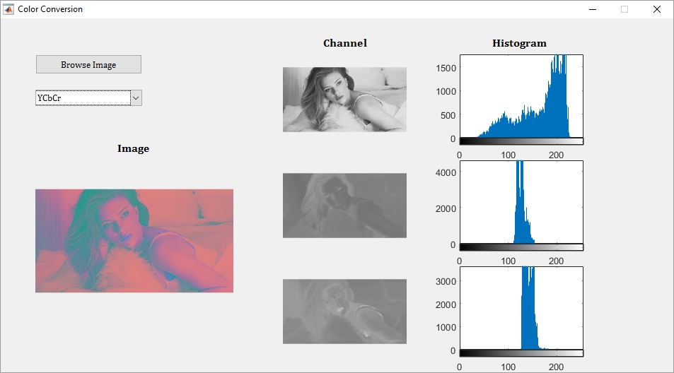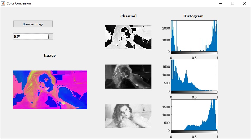 Berikut ini merupakan contoh aplikasi pemrograman GUI Matlab untuk mengkonversi ruang warna citra RGB menjadi ruang warna yang lain.