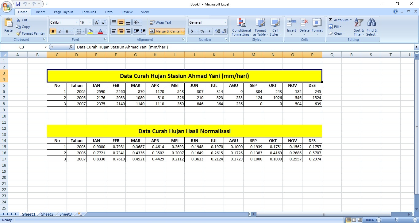 Data curah hujan asli dan setelah dinormalisasi tampak pada gambar di bawah ini: