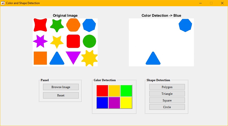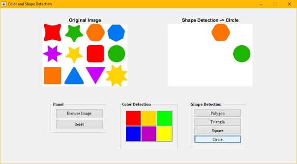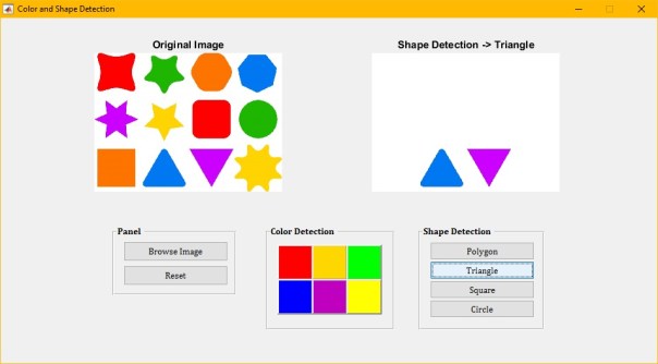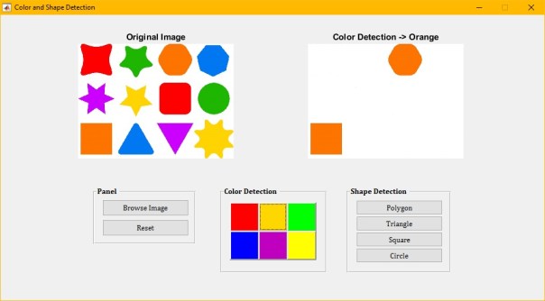 Berikut ini merupakan contoh aplikasi pemrograman GUI Matlab untuk mendeteksi warna dan bentuk suatu objek pada citra digital.