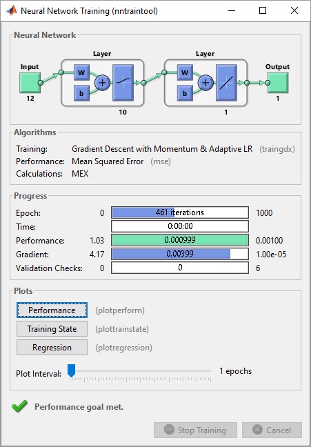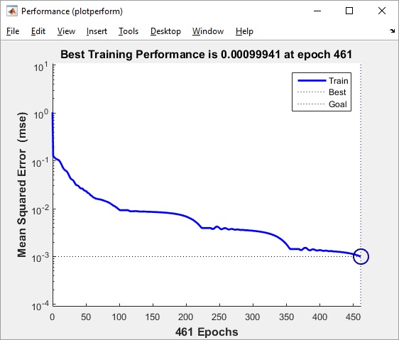 Pada pelatihan ini error goal (MSE) sebesar 0,00099941 dicapai pada epoch yang ke-461 seperti ditunjukkan pada gambar di bawah ini: