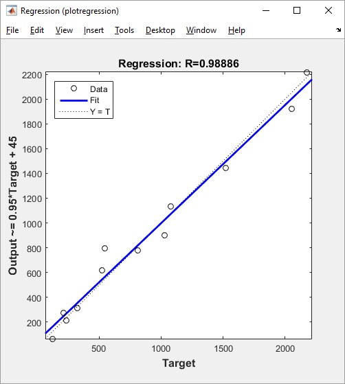 Sedangkan koefisien korelasi R yang dihasilkan adalah sebesar 0,98886 seperti yang ditunjukkan pada gambar berikut: