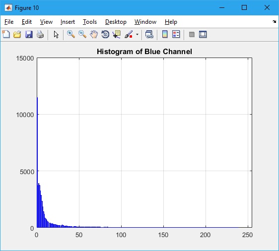histogram(B_pix_val,256,'FaceColor','b','EdgeColor','b')