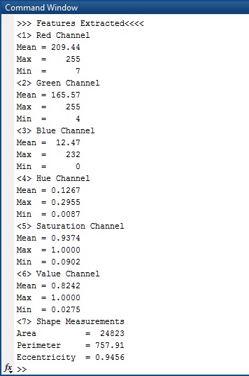 5. Melakukan ekstraksi ciri citra ikan berdasarkan pada ciri statistik dan ciri bentuk. Ciri statistik yang digunakan adalah nilai mean, max, dan min dari intensitas warna citra RGB dan HSV. Sedangkan ciri bentuk yang digunakan adalah luas, keliling, dan eccentricity.