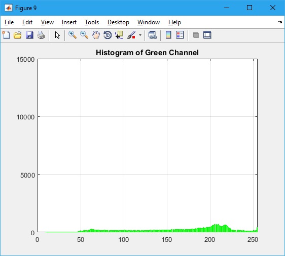 histogram(G_pix_val,256,'FaceColor','g','EdgeColor','g')