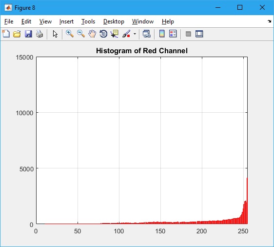 histogram(R_pix_val,256,'FaceColor','r','EdgeColor','r')