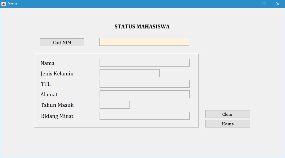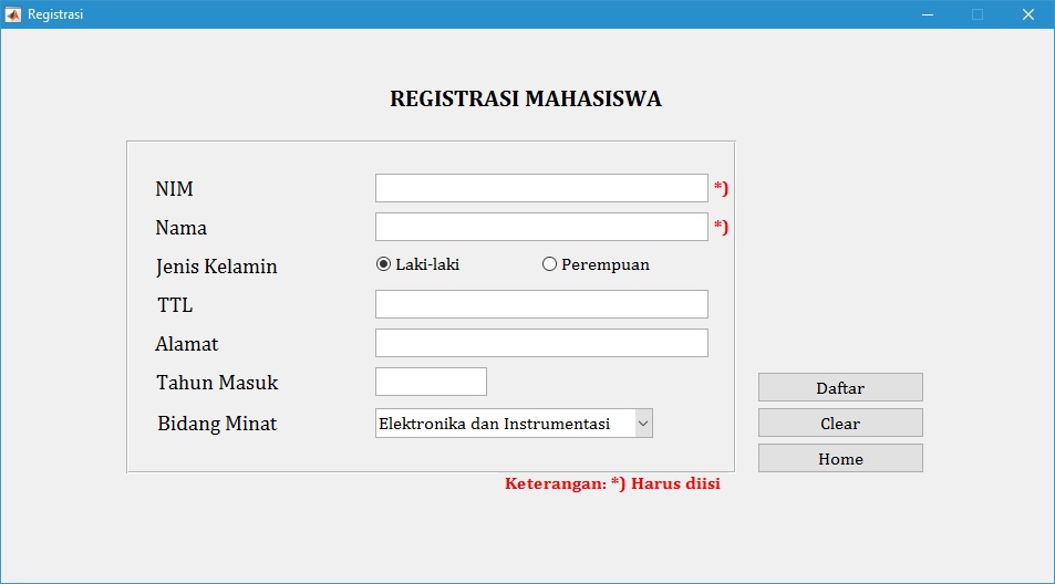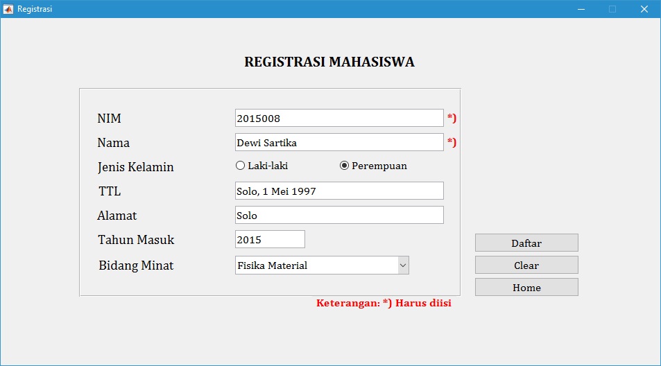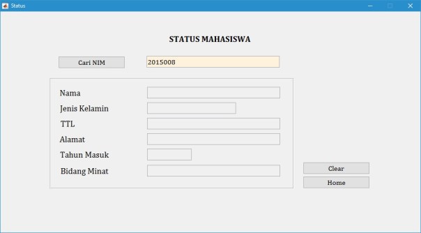 Pada menu ini disajikan form untuk mengisi data mahasiswa. Data yang dapat diisikan antara lain adalah Nomor Induk Mahasiswa (NIM), Nama, Jenis Kelamin, Tempat dan Tanggal Lahir (TTL), Alamat, Tahun Masuk, dan Bidang Minat.