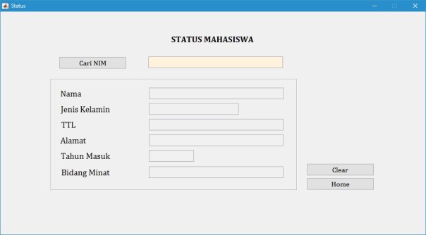 Pada menu ini disajikan 4 buah tombol untuk masuk ke dalam tampilan submenu yang lain. Submenu yang lain antara lain yaitu Menu Registrasi Mahasiswa, Menu Status Mahasiswa, Menu Database Mahasiswa, dan Menu Keluar.