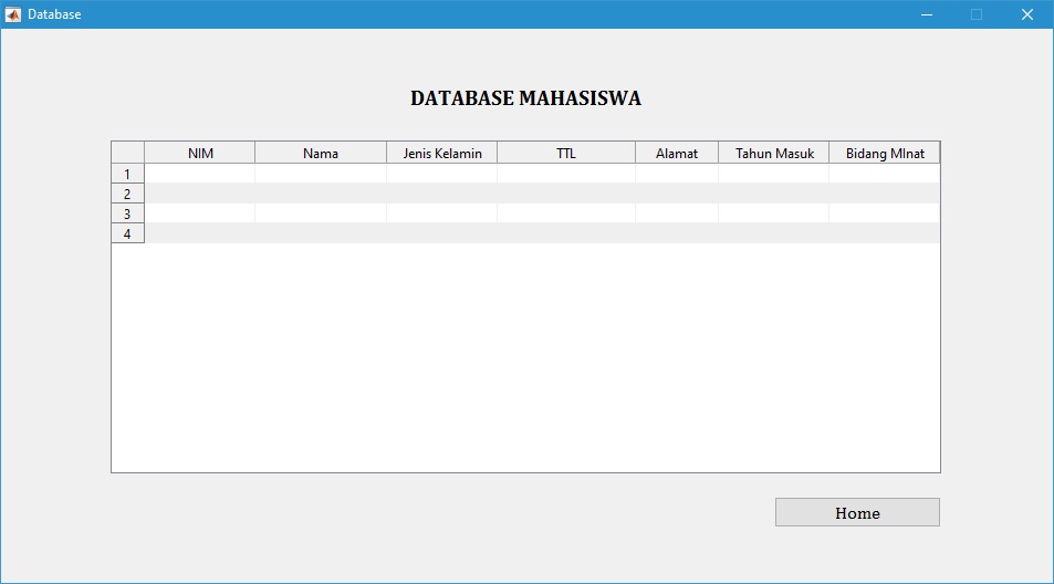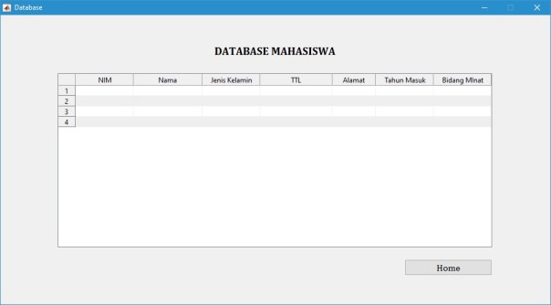 Dalam pembuatan basis data (database), Matlab dapat diintegrasikan dengan beberapa software lain contohnya adalah Microsoft Office Excel 2007. Berikut ini merupakan contoh aplikasi pemrograman matlab untuk membuat database mahasiswa menggunakan GUI Matlab R2015b.