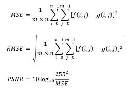 MSE dan RMSE tidak memiliki satuan sedangkan satuan dari PSNR adalah desibel. Semakin mirip kedua citra maka nilai MSE dan RMSE nya semakin mendekati nilai nol. Sedangkan pada PSNR, dua buah citra dikatakan memiliki tingkat kemiripan yang rendah jika nilai PSNR di bawah 30 dB.