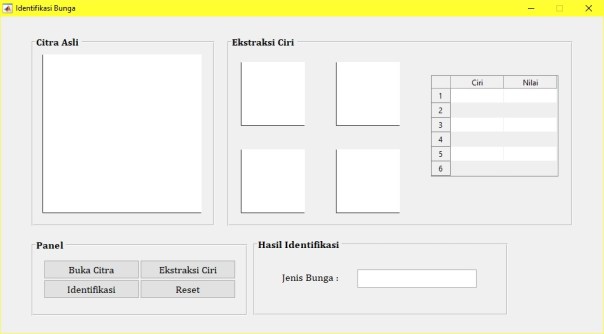 6. Membuat tampilan GUI agar proses identifikasi jenis bunga dapat lebih interaktif. Tampilan awal GUI ditunjukkan pada gambar di bawah ini.