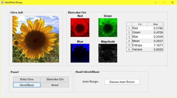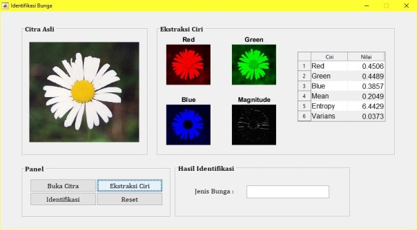 Ciri yang digunakan untuk membedakan kedua jenis bunga tersebut adalah ciri warna RGB berdasarkan nilai rata-rata R, G, dan B, dan ciri tekstur filter gabor berdasarkan nilai mean (rata-rata), entropy, dan varians dari citra magnitude.