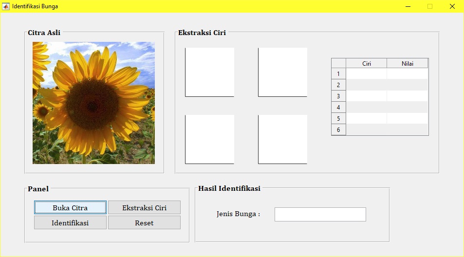 6. Membuat tampilan GUI agar proses identifikasi jenis bunga dapat lebih interaktif. Tampilan awal GUI ditunjukkan pada gambar di bawah ini.