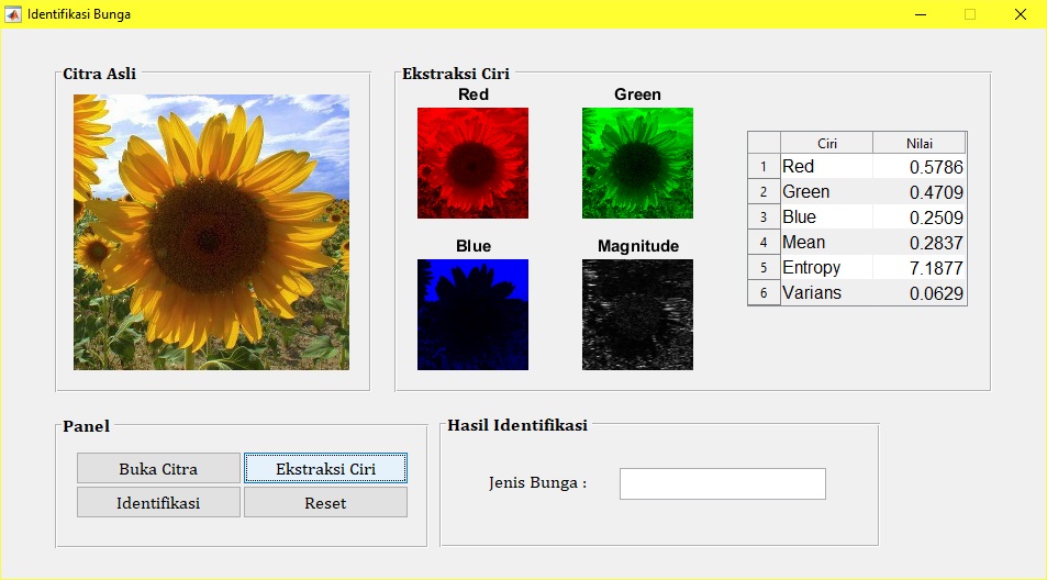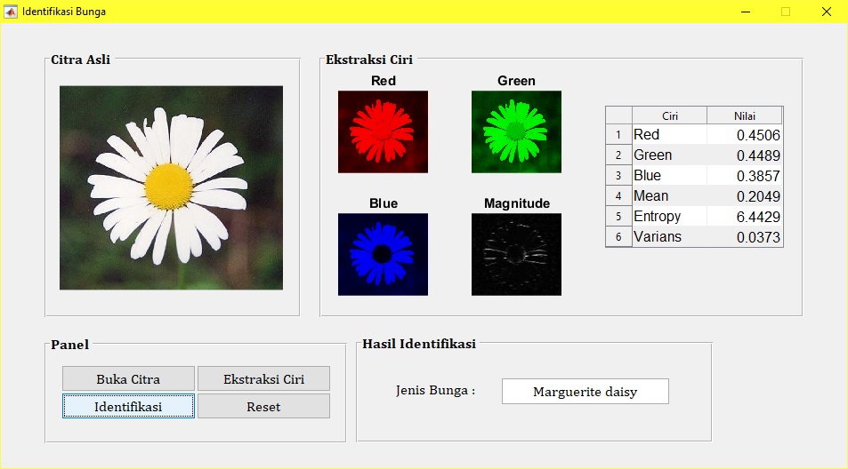 Ciri yang digunakan untuk membedakan kedua jenis bunga tersebut adalah ciri warna RGB berdasarkan nilai rata-rata R, G, dan B, dan ciri tekstur filter gabor berdasarkan nilai mean (rata-rata), entropy, dan varians dari citra magnitude.