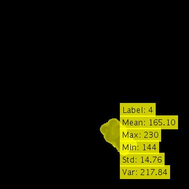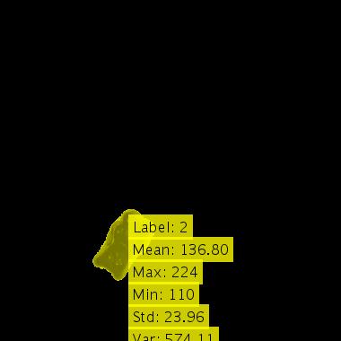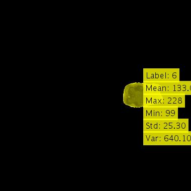 7. Melakukan pelabelan terhadap masing-masing objek yang tersegmentasi, melakukan ekstraksi ciri berdasarkan parameter mean, max intensity, min intensity, standard deviation, dan variance, serta menampilkan hasil ekstraksi ciri pada masing-masing objek yang terlabeli