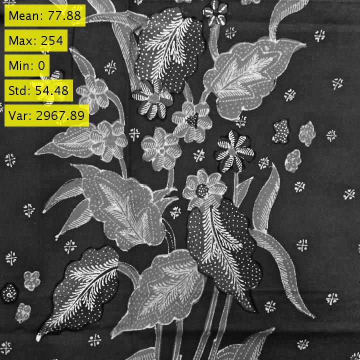 3. Melakukan ekstraksi ciri berdasarkan parameter mean, max intensity, min intensity, standard deviation, dan variance, serta menampilkan hasilnya pada citra grayscale