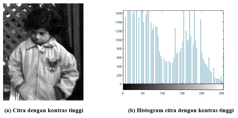 Citra dengan kontras tinggi merupakan citra yang memiliki range nilai intensitas yang lebar. Histogram citra pada Gambar 5 di bawah ini menunjukkan bahwa citra berada pada range nilai intensitas 0-255.