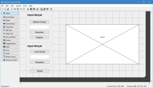 Berikut ini merupakan contoh aplikasi pemrograman GUI MATLAB untuk melakukan akuisisi sinyal suara. Proses akuisisi dilakukan dengan cara merekam suara menggunakan mikrofon yang ada pada komputer atau laptop.
