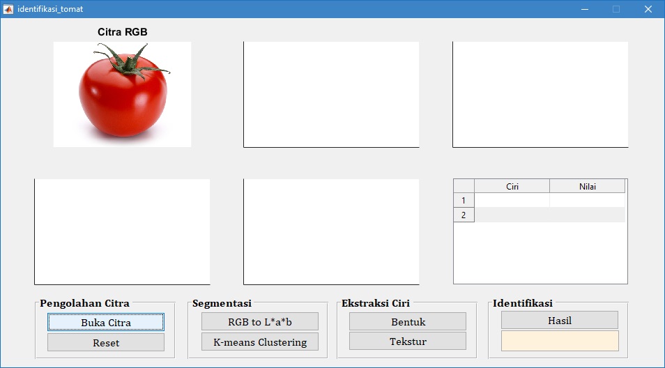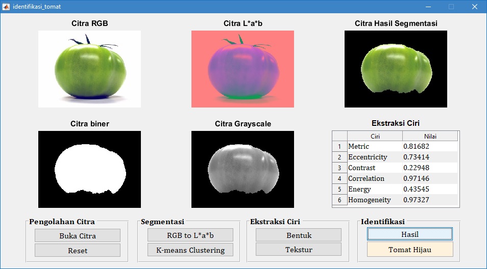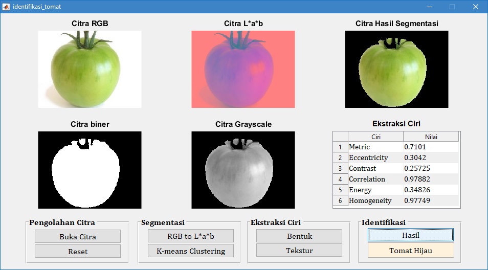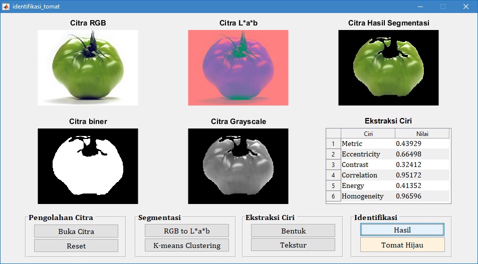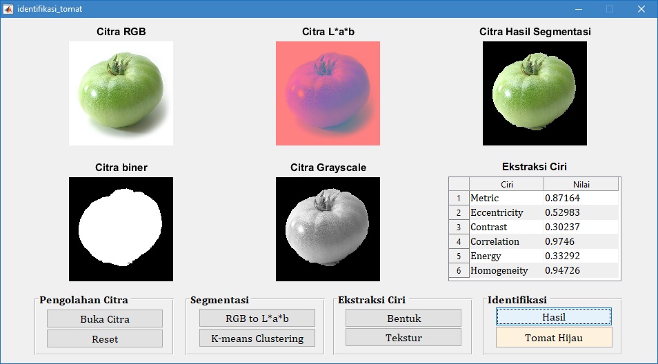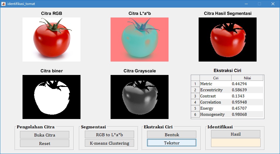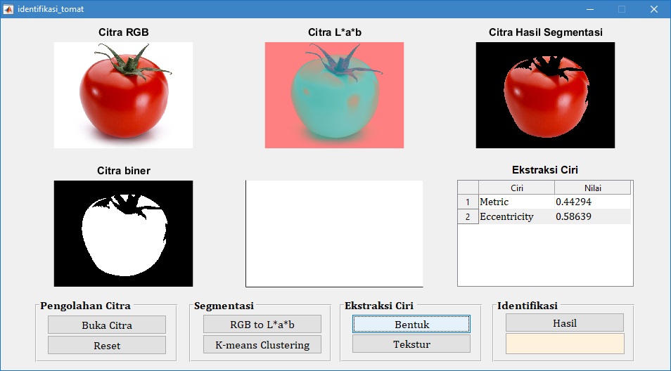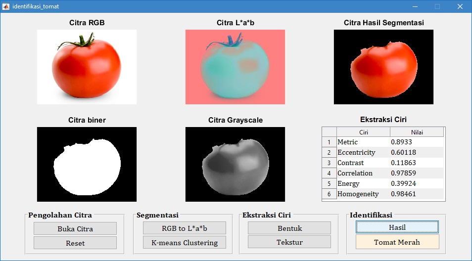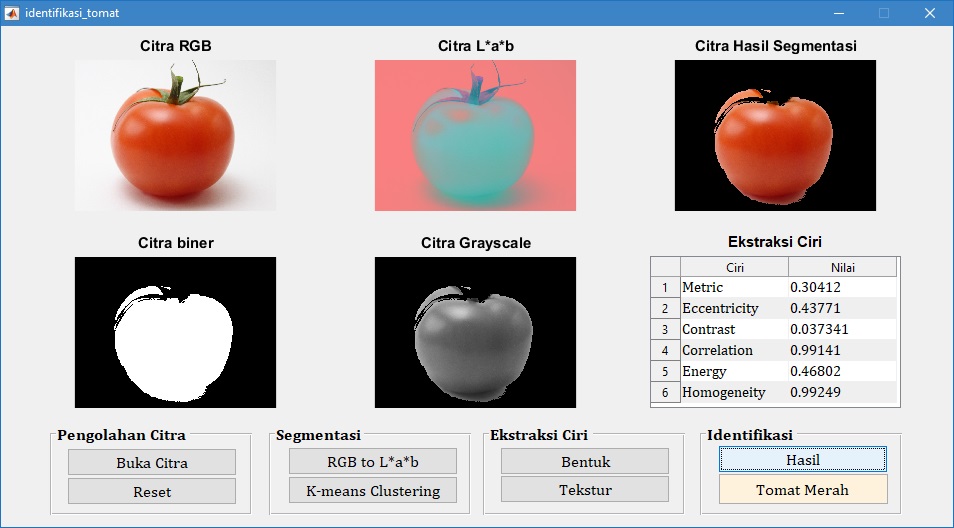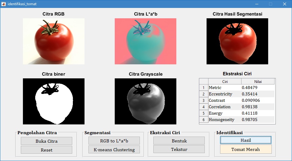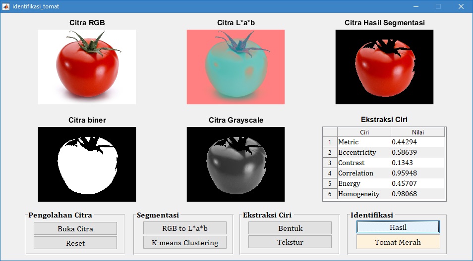 Pada tampilan GUI di atas, tampak bahwa citra buah tomat merah diidentifikasi juga sebagai tomat merah. Hal ini menunjukkan bahwa proses identifikasi sesuai dengan target yang diharapkan.