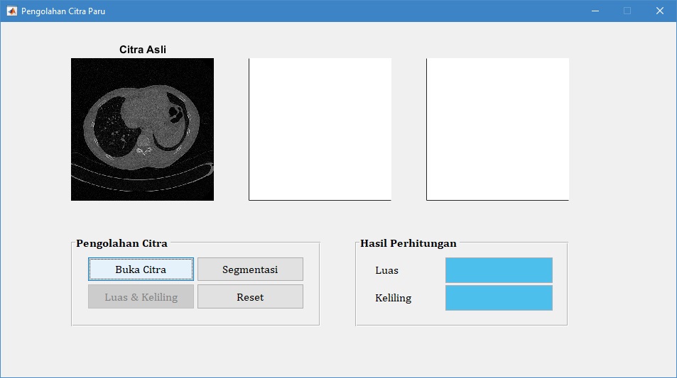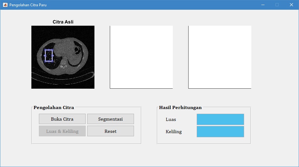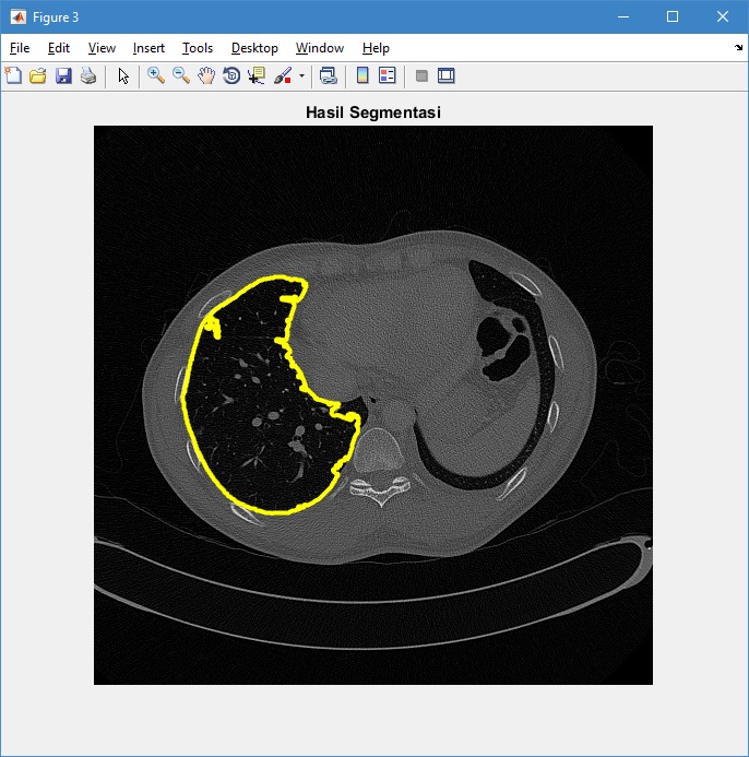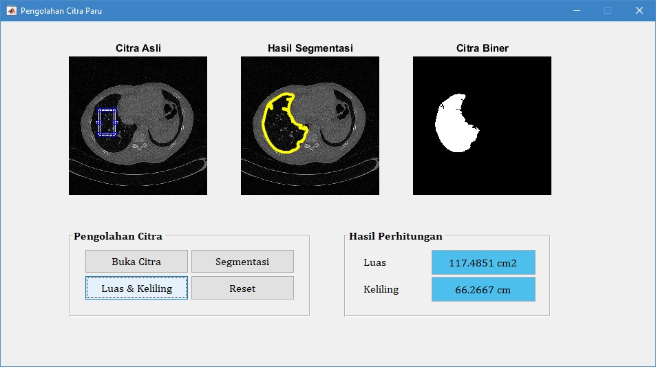 Penelitian mengenai pengolahan citra medis telah banyak dilakukan dengan mengembangkan berbagai macam metode pengolahan citra. Penelitian yang dilakukan di antaranya bertujuan untuk meningkatkan kualitas citra agar citra lebih mudah diinterpretasi dan untuk menganalisis citra secara objektif. Berikut ini merupakan contoh aplikasi pemrograman MATLAB untuk melakukan pengolahan citra CT Scan Paru-Paru dengan metode segmentasi active contour. Citra diakuisisi dengan modalitas pesawat CT Scan berformat DICOM (Digital Imaging and Communications in Medicine). Pengolahan citra dilakukan untuk menghitung luas dan keliling daerah paru-paru.