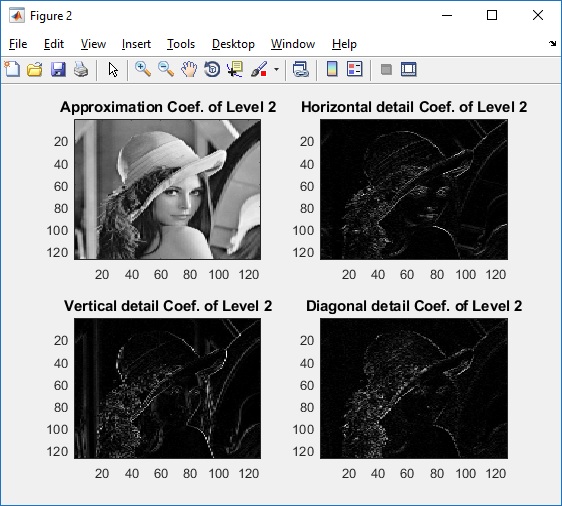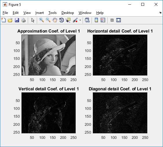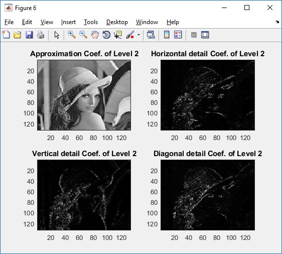 Fungsi pengolahan citra digital di atas adalah memperoleh hasil transformasi yang berupa koefisien-koefisien wavelet yaitu koefisien aproksimasi, koefisien detail vertikal, koefisien detail horizontal, dan koefisien detail diagonal. Koefisien-koefisien tersebut dapat digunakan lebih lanjut untuk keperluan ekstraksi ciri, kompresi, dan keperluan-keperluan lainnya.