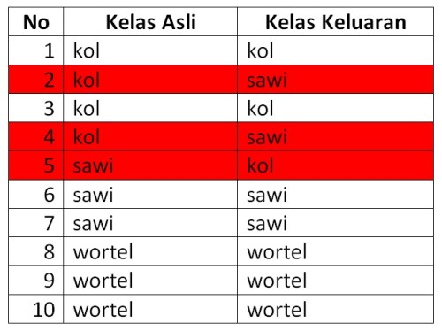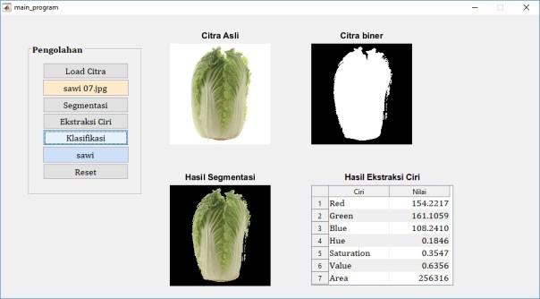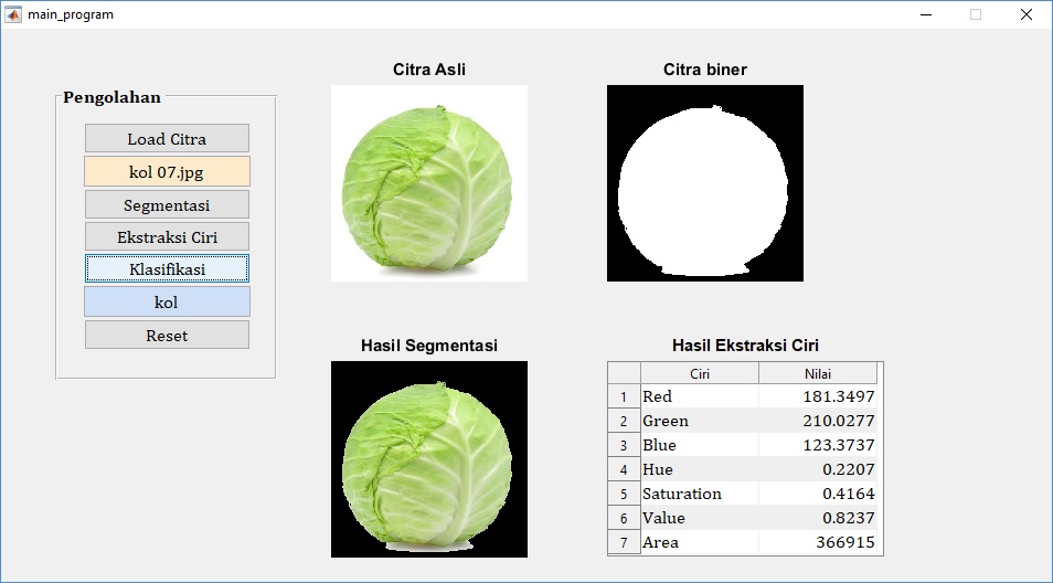Metode pengolahan citra di atas menunjukkan bahwa jenis sayuran dapat diklasifikasikan dengan baik. Dengan didasari oleh teori pengolahan citra, kita dapat mengembangkan metode pengolahan citra terbaru lainnya untuk klasifikasi objek agar diperoleh tingkat akurasi yang lebih baik.