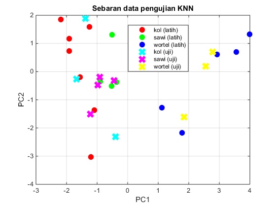 Berikut ini merupakan contoh pemrograman matlab untuk klasifikasi jenis sayuran menggunakan algoritma PCA dan KNN. Jenis sayuran yang akan diklasifikasi adalah sayur kol, sawi, dan wortel. Ketiga jenis sayur tersebut dibedakan berdasarkan ciri warna dan ukurannya. Contoh citra sayuran pada masing-masing kelas ditunjukkan pada gambar di bawah ini.
