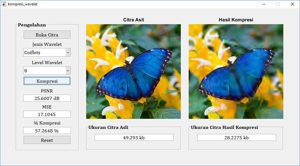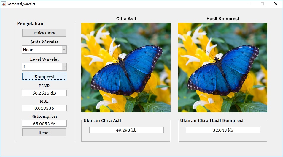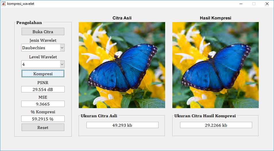 Salah satu metode lossless yang dapat digunakan untuk melakukan kompresi citra adalah menggunakan transformasi wavelet diskrit (discrete wavelet transform). Jenis wavelet pada DWT antara lain adalah haar, daubechies, symlets, dan coiflets. Berikut ini merupakan contoh aplikasi pemrograman matlab untuk melakukan kompresi citra digital menggunakan transformasi wavelet.