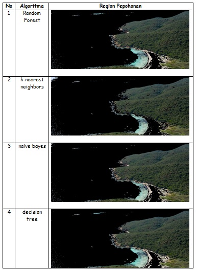 Berikut ini merupakan contoh aplikasi pengolahan citra untuk melakukan segmentasi citra menggunakan algoritma klasifikasi. Citra yang digunakan adalah citra ‘plage de carataggio tahiti beach.jpg’ yang akan dikelompokkan dalam 3 kelas region yaitu region laut, region pepohonan, dan region pasir. Algoritma klasifikasi yang digunakan antara lain adalah random forest, k-nearest neighbors, naive bayes, dan decision tree (pohon keputusan).