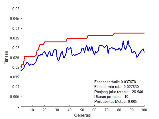if (Fitness(ii) <= MinF), MinF = Fitness(ii); end end FitnessRataRata = mean(Fitness); plotvector1 = get(hbestplot1,'YData'); plotvector1(generasi) = MaxF; set(hbestplot1,'YData',plotvector1); plotvector2 = get(hbestplot2,'YData'); plotvector2(generasi) = FitnessRataRata; set(hbestplot2,'YData',plotvector2); set(htext1,'String',sprintf('Fitness terbaik: %7.6f', MaxF)); set(htext2,'String',sprintf('Fitness rata-rata: %7.6f', FitnessRataRata)); set(htext3,'String',sprintf('Panjang jalur terbaik: %7.3f', 1/MaxF)); set(htext4,'String',sprintf('Ukuran populasi: %3.0f', UkPop)); set(htext5,'String',sprintf('Probabilitas Mutasi: %4.3f', Pmutasi)); drawnow if MaxF < Fthreshold,