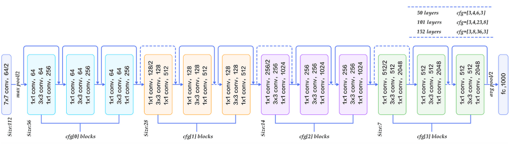 ResNet adalah arsitektur CNN yang diperkenalkan oleh Kaiming He et al. pada tahun 2015. Salah satu masalah dalam melatih jaringan yang sangat dalam adalah gradien yang menghilang atau meledak saat melalui lapisan-lapisan yang dalam. ResNet mengatasi masalah ini dengan menggunakan blok-blok identitas yang memungkinkan gradien melompat atau shortcut. Dengan menggunakan pendekatan ini, ResNet dapat melatih jaringan yang lebih dalam dengan lebih efisien dan secara signifikan meningkatkan kinerja dalam berbagai tugas pengenalan gambar.