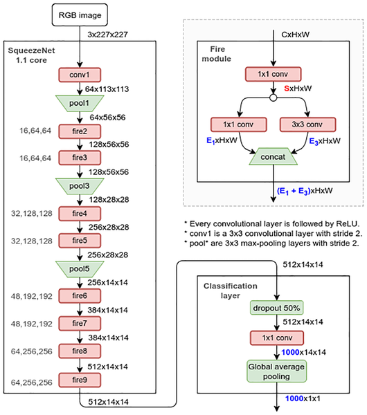 SqueezeNet adalah arsitektur CNN yang dirancang untuk mencapai kinerja setara dengan arsitektur yang lebih besar seperti AlexNet atau VGG, tetapi dengan menggunakan lebih sedikit parameter. SqueezeNet menggunakan blok “Fire” yang terdiri dari kombinasi lapisan 1×1 convolution (disebut squeeze layer) dan lapisan 1×1 dan 3×3 convolution (disebut expand layer) untuk mengurangi jumlah parameter tanpa mengorbankan performa.
