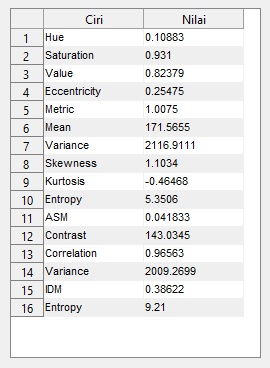 - Ciri Tekstur GLCM (Gray Level Co-Occurence Matrix): Ciri tekstur orde satu dan orde dua GLCM memberikan informasi tentang pola tekstur dan hubungan antara piksel-piksel dalam citra.
