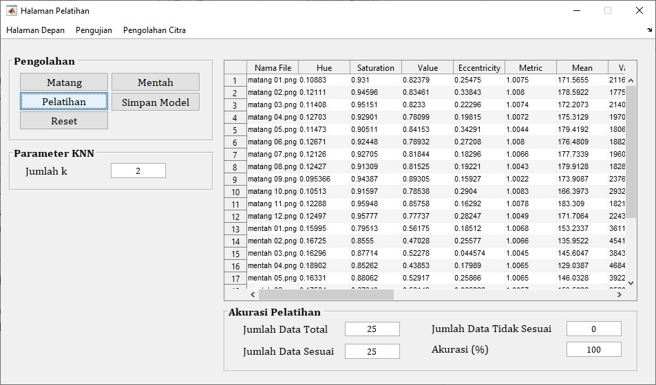 Buah jeruk adalah salah satu komoditas buah yang sangat populer dan memiliki nilai gizi yang tinggi. Identifikasi tingkat kematangan buah jeruk dengan akurasi yang tinggi menjadi kunci dalam memastikan kualitas produk dan pengelolaan persediaan yang efisien. Dalam upaya ini, pengolahan citra dengan metode K-Nearest Neighbor (K-NN) telah terbukti menjadi alat yang efektif dalam mengatasi tantangan tersebut dengan ketepatan dan reliabilitas.