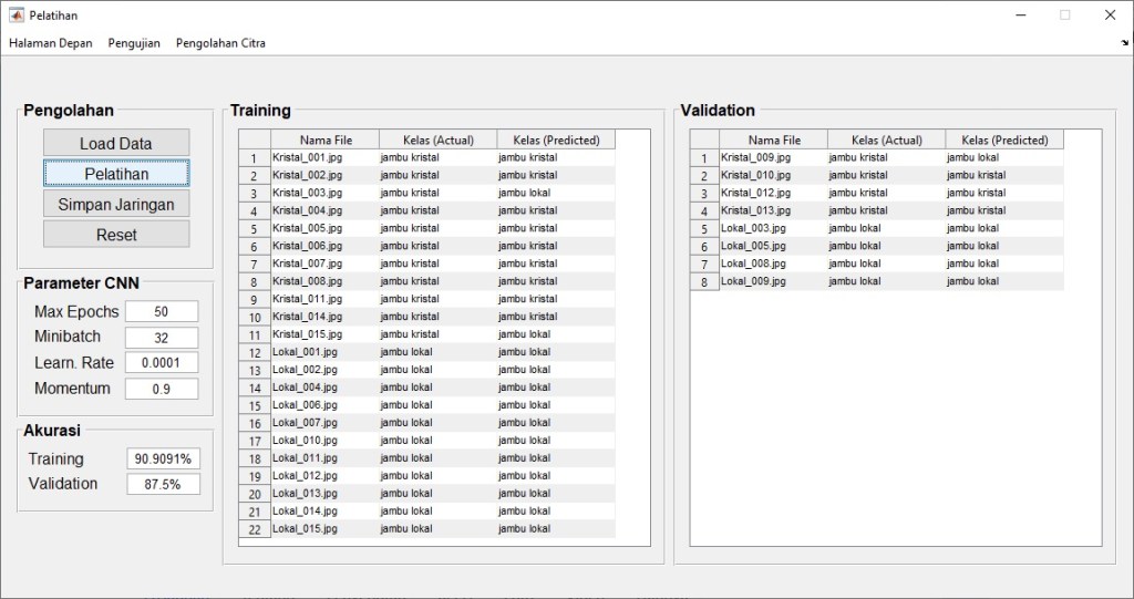 Pengolahan citra dengan Convolutional Neural Network AlexNet telah terbukti sebagai pendekatan yang efektif dalam mengklasifikasikan jenis jambu biji. Dengan menggunakan teknologi ini, kami dapat dengan mudah mengenali jambu biji kristal dan jambu biji lokal dengan tingkat akurasi yang tinggi. Ini membuka peluang baru dalam pengelolaan pertanian yang lebih cerdas dan berkelanjutan, serta mendorong inovasi dalam industri pertanian dan hortikultura.